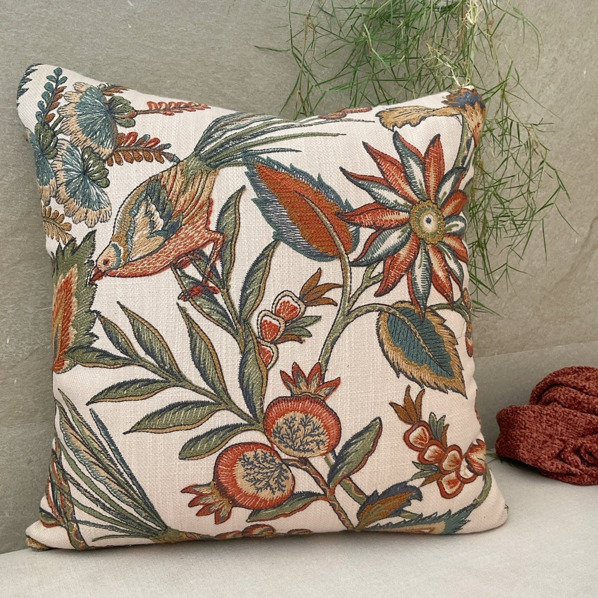 Chitravana is a tapestry of colour and craft, brought to life with intricate embroidery on natural linen. Its lush foliage, blooming florals, and perched bird create a scene that feels timeless yet celebratory.