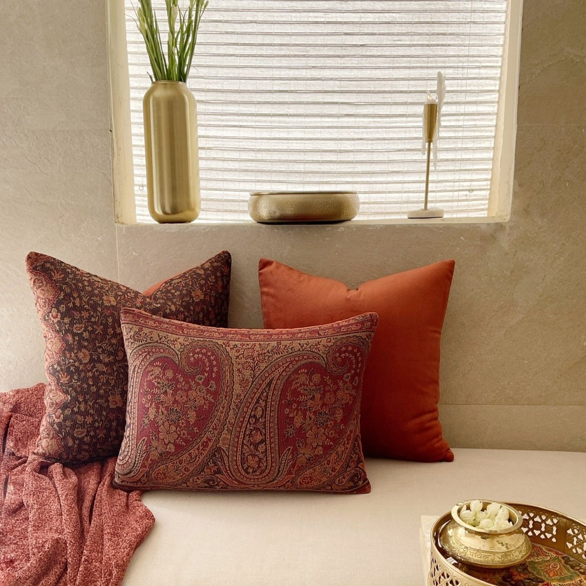 An ode to heritage, this woven cushion features timeless paisley motifs in rich maroon and antique gold.