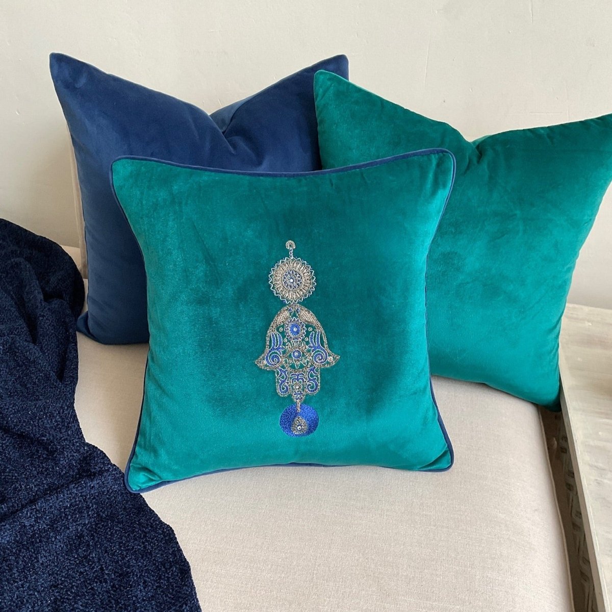 The Nazare Sapphire Trio draws on the ancient talisman of the evil eye, reimagined through intricate hand embroidery. Set against jewel-toned velvets in sapphire and teal, the central motif becomes both guardian and ornament - an emblem believed to ward off negativity while inviting harmony and protection. Paired with its solid companions, this trio is a conversation between symbolism and style, steeped in cultural meaning yet entirely contemporary in design.