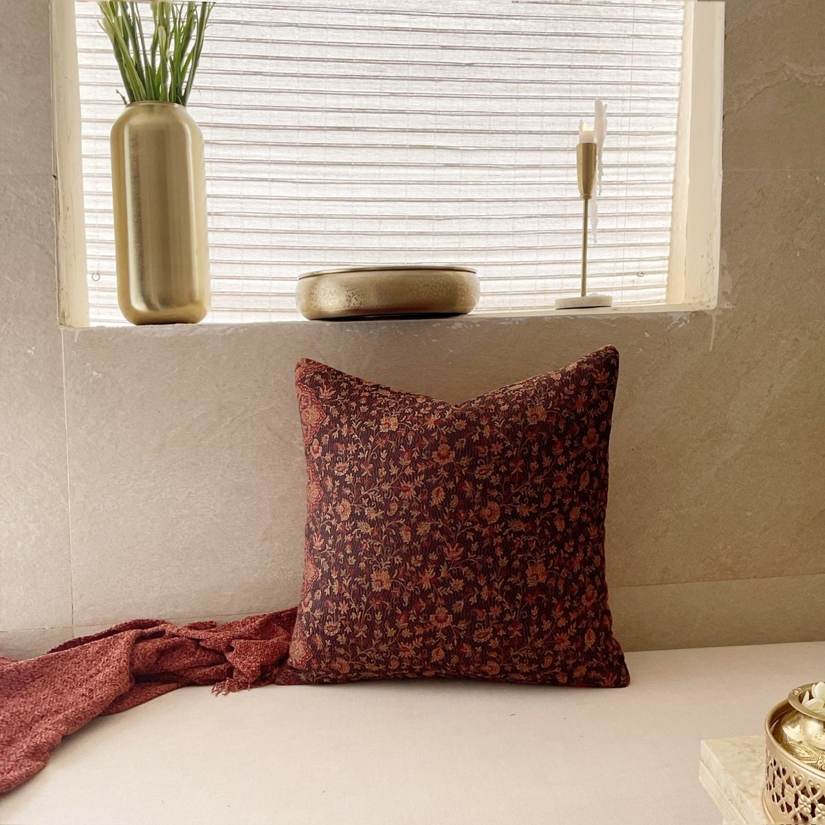 With its delicate floral jaal, this cushion is a tapestry of tradition. In festive maroon tones, it evokes the beauty of blooming gardens lit by Diwali diyas.